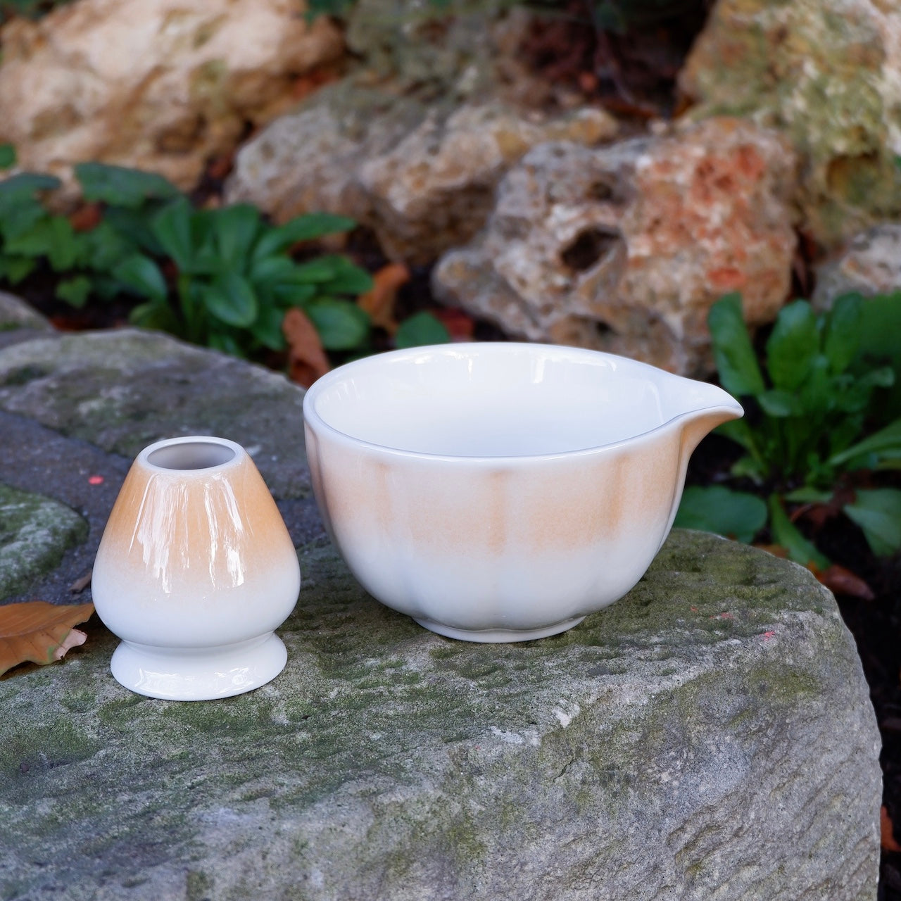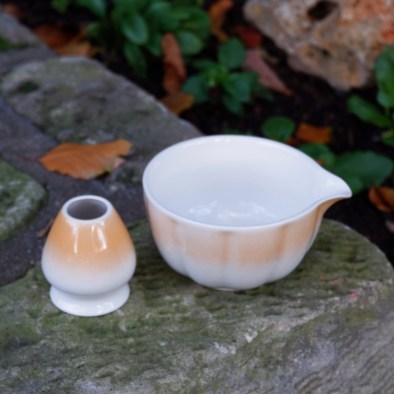 This charming set includes one matcha bowl (chawan) and one whisk stand (chasen holder) — inspired by the shape and warmth of a pumpkin, symbolizing harvest, abundance, and comfort.